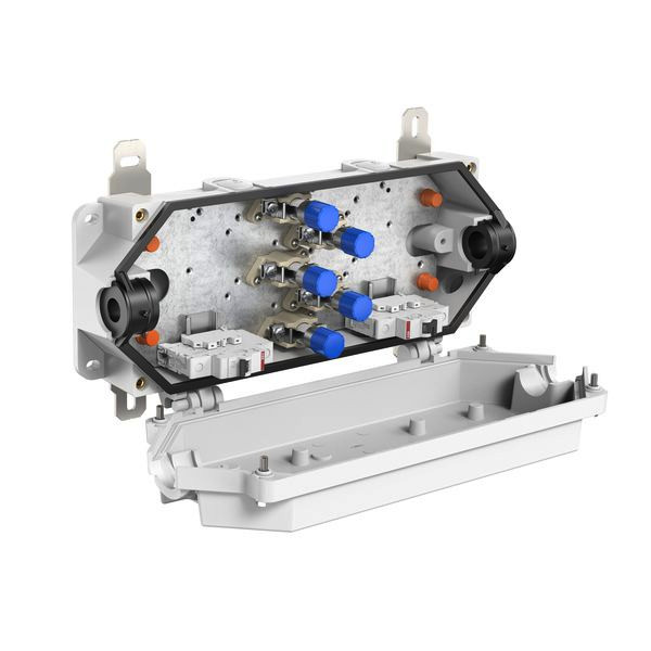 Abzweigkasten, mit Schutzart IP66/IP67, Ui=400 V AC, M25, (5 seitlich), außenliegende Befestigungsstellen, für Installationen im industriellen Umfeld und Tunnelbereich, Druck-Sog-Dicht nach Gotthard-Richtlinie. Halogenfreies Gehäuse aus Spezialduroplast, Klemmen aus hochtemperaturbeständiger Spezialkeramik. Außenbefestigungslaschen und Deckelschrauben aus Edelstahl 1.4571, grau, Durchgang: 5-polige Klemme für ungeschnittene Leiter, Klemmbereich für ungeschnittene Leiter 16mm² bis 50mm², Klemmbereich für geschnittene Leiter 16mm² bis 35mm², Bemessungsstrom 100A. Abgesicherter Abzweig 4-polig bis 6mm², Absicherung durch 2 x Leitungsschutzschalter einpolig B10, vorverdrahtet. Dichtbereich Hauptkabel: 21-26mm (andere Dichtbereiche auf Anfrage)
