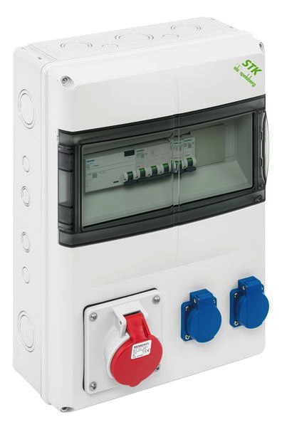 Steckdosenkombination, mit Schutzart IP44, anschlussfertig nach EN61439-3, mit zentraler Anschlussklemme 4-25mm², 5-polig, auch geeignet zum Durchschleifen der Zuleitung, werkzeuglos entnehmbare Normschienen zur einfachen Leitungsverlegung im Gehäuse, CEE-Steckdosen mit 20°Neigung, einfache Kombination mit STK-Zusatzgehäusen oder AK Air Verteilern mit Flanschöffnungen (AK-F), inkl. Flansche, verfügbare Teilungseinheiten: 14