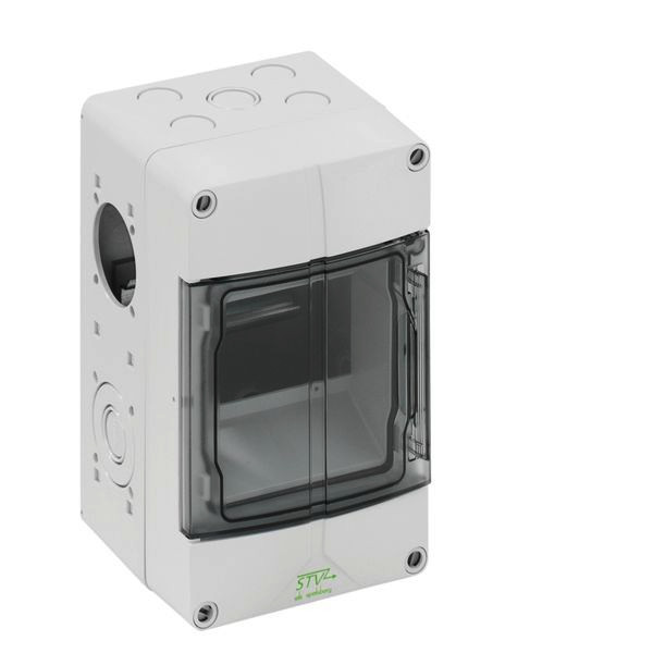 Steckdosenleergehäuse, mit Schutzart IP44, geeignet zum kundenseitigen Einbau von Reiheneinbaugeräten und Anbausteckdosen, inkl. PE-/N-Klemme sowie Adaptern und Schrauben zur Montage der Steckdosen, hohe mechanische Belastbarkeit, temperaturunempfindlich, kombinierbar, halogenfrei