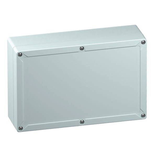 Leergehäuse, mit Schutzart IP66/IP67, Polycarbonat, zertifiziert durch UL (UL 50 & CSA 22.2 No. 94.1-07, UL 50E & CSA C22.2 No. 94.2-07), DLG (Ammoniakbeständigkeit), Ui=690V AC, Ui=1000V DC, innenliegende Befestigungsstellen, für Installationen im industriellen Umfeld und geschütztem Außenbereich, mit Schnellverschluss, Kasten: Polycarbonat, grau, Deckel: Polycarbonat, grau, glatte Seitenwände