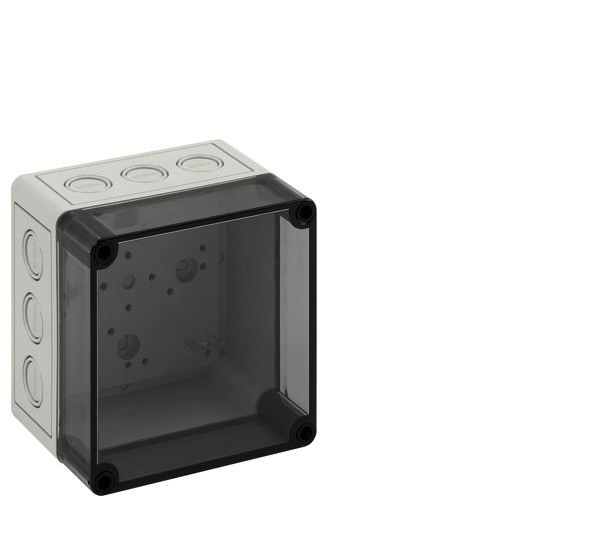 m = metrisch, o = ohne Vorprägung Leergehäuse, mit Schutzart IP66, Polystyrol, Ui=690V AC, Ui=1000V DC, innenliegende Befestigungsstellen, für Standardinstallationen im Innenbereich, Kasten: Polystyrol, grau, Deckel: Polycarbonat, transparent, Ausschlagmembranen, M20/M25/M32, (12 seitlich)