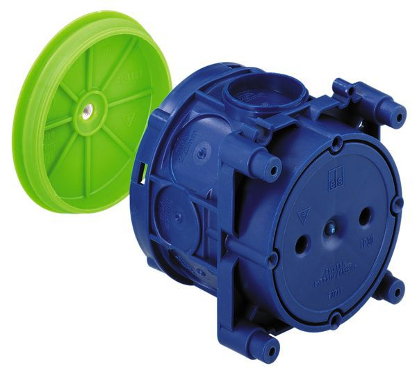 mit glatter Stirnseite für Klebebefestigung, 2-teilig Deckenverbindungsdose, 4 Schraubdome mit Schraubabstand 60mm, mit M5 Gewindebuchse (Traglast 10kg) zur Aufnahme eines Deckenhakens, kombinierbar im Normabstand 71mm, vollisolierter Leitungsübergang, geeignet für alle Schalungsarten und Gegenschalung, mit Schutzart IP30, Bemessungsisolationsspannung: 400V AC, halogenfrei, Klebebefestigung oder Nagelbefestigung, Membran zur Lochung, Dichtbereich M16-M25