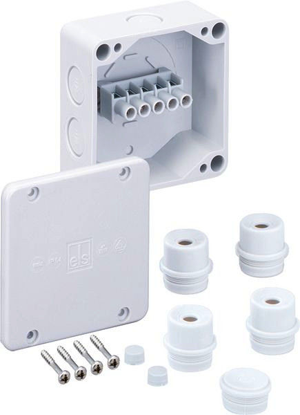 Abzweigkasten, mit Schutzart IP54, Nennquerschnitt 4mm², Ui=690 V AC, zertifiziert durch VDE (DIN EN 60670-1/-22 (VDE 0606-1/-22)), Ausschlagmembranen, M20, (7 seitlich), innenliegende Befestigungsstellen, für Standardinstallationen im Innenbereich, grau, mit Schraubklemme, 5-polig-2,5/4mm² (4 x 1,5² / 4 x 2,5² / 4 x 4²)