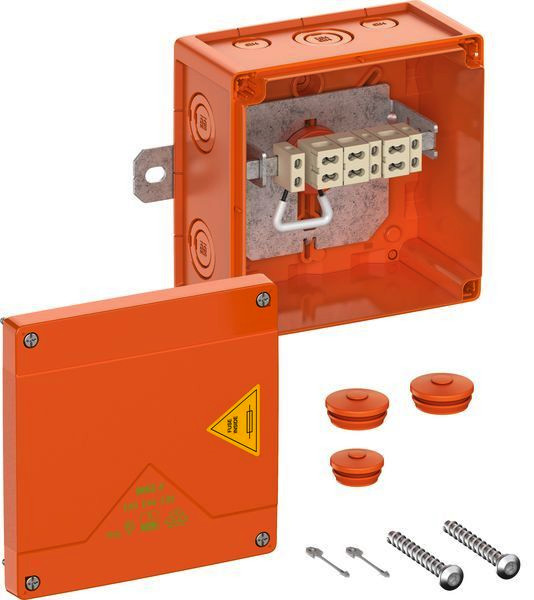 Abzweigkasten, mit Schutzart IP66, Ui=450 V AC, zertifiziert durch UL-EU (EN 62208), UL-EU (EN 61439-1/-2), Ausschlagmembranen, M20/M25/M32, (2 rückseitig, 12 seitlich), außenliegende Befestigungsstellen, mit elektrischem Funktionserhalt E30-E90 nach DIN 4102 Teil 12. Halogenfreies Gehäuse aus Spezialthermoplast, Klemmen aus hochtemperaturbeständiger Spezialkeramik, Klemmenhalter frei positionierbar, orange, Verbindungskasten 5-polig 0,5-6mm², Abzweigkasten 3-polig 0,5-6mm², Sicherung im Abzweig 1 x 2A (innenliegend, 1 x WKE BS F2A, 86300101), Anzahl der klemmbaren Leiter pro Klemmstelle: 4 x 0,5² / 2 x 0,75² / 3 x 1² / 3 x 1,5² / 1 x 2,5² / 1 x 4² / 1 x 6²