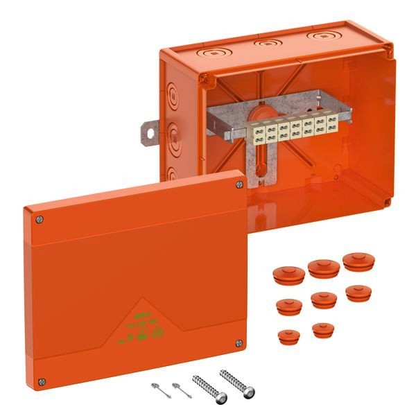 Abzweigkasten, mit Schutzart IP66, Ui=450 V AC, zertifiziert durch VDE (DIN EN 60670-1/-22 (VDE 0606-1/-22)), UL-EU (EN 62208), Ausschlagmembranen, M20/M25/M32/M40, (4 rückseitig, 12 seitlich), außenliegende Befestigungsstellen, mit elektrischem Funktionserhalt E30-E90 nach DIN 4102 Teil 12. Halogenfreies Gehäuse aus Spezialthermoplast, Klemmen aus hochtemperaturbeständiger Spezialkeramik, Klemmenhalter frei positionierbar, orange, Verbindungskasten 7-polig 0,5-6mm², Abzweigkasten 7-polig 0,5-6mm², Anzahl der klemmbaren Leiter pro Pol: 16 x 0,5² / 8 x 0,75² / 12 x 1² / 12 x 1,5² / 4 x 2,5² / 4 x 4² / 4 x 6²
