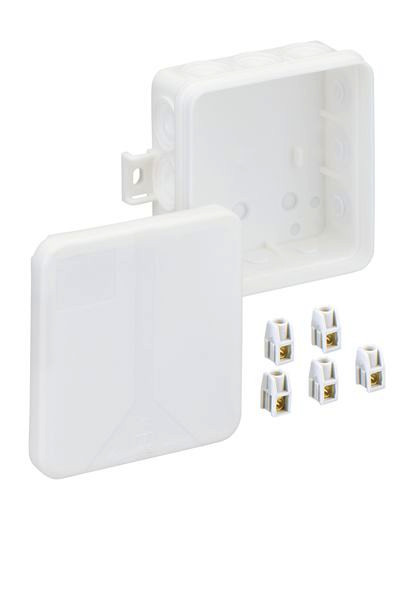 Abzweigdose, mit Schutzart IP55, Nennquerschnitt 2,5mm², Ui=400 V AC, zertifiziert durch VDE (DIN EN 60670-1/-22 (VDE 0606-1/-22)), selbstdichtende Einführungsmembranen, Dichtbereich 8,2-12,5mm, (3 rückseitig, 12 seitlich), außenliegende Befestigungsstellen, für Standardinstallationen im Innenbereich, weiß, In=24 A, mit 5 aneinanderreihbaren Schraubklemmen 2,5mm² (5 x1² / 5 x 1,5² / 3 x 2,5²)