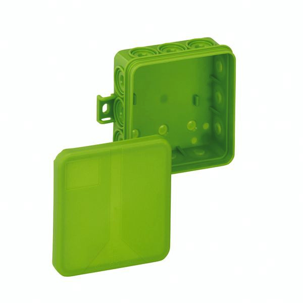zur Kennzeichnung von Stromkreisen der Ersatzstromversorgung Abzweigdose, mit Schutzart IP55, Nennquerschnitt 2,5mm², Ui=400 V AC, zertifiziert durch VDE (DIN EN 60670-1/-22 (VDE 0606-1/-22)), selbstdichtende Einführungsmembranen, Dichtbereich 8,2-12,5mm, (3 rückseitig, 12 seitlich), außenliegende Befestigungsstellen, für Standardinstallationen im Innenbereich, grün, ohne Klemmen