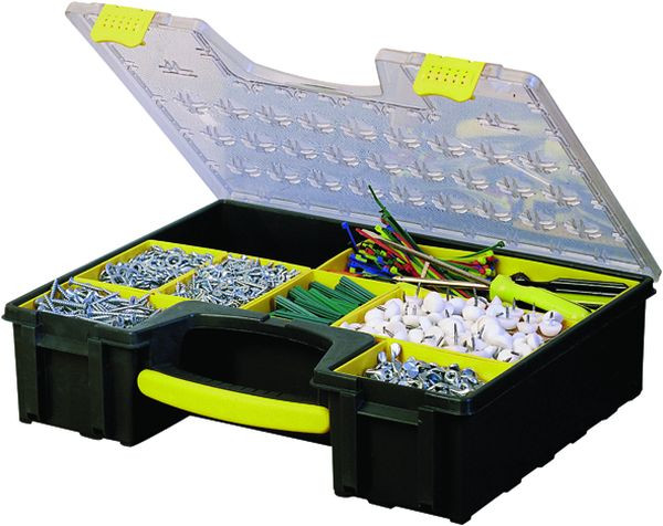 mit 8 tiefen Boxen, herausnehmbare Boxen in 3 verschiedenen Größen, unzerbrechlicher Polycarbonat-Deckel, Spezial-Deckel fixiert Boxen auch wenn einige entnommen sind.