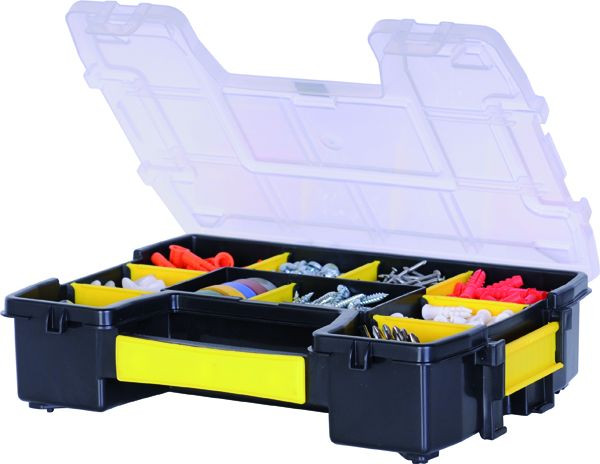 Innovatives Verriegelungssystem ermöglicht die Verbindung und Transport von bis zu drei einzelnen Organizern, seitliche Verriegelungen für sicheres Stapeln, entnehmbare Einsätze ermöglichen die kombinierte Aufbewahrung von Werkzeugen und Kleinteilen, die spezielle Konstruktion des Deckels hält Kleinteile und Einsätze an ihrem Platz Stanley Sortmaster Organizer / einzeln