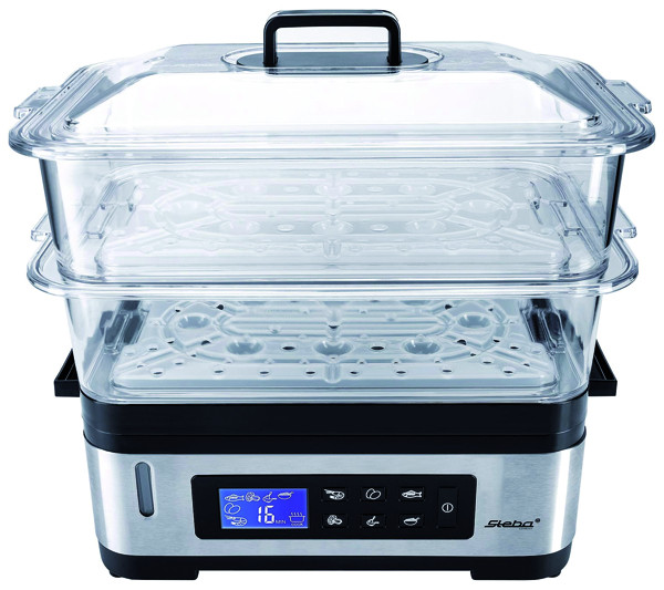 2 transparente Gareinsätze (BPA-frei) mit herausnehmbaren Böden (je 3 l), Reiseinsatz, außenliegende Wasser-Nachfüllöffnung, Wasserfüllstandsanzeige, LCD-Display mit 5 Automatikprogrammen, automatisches Warmhalten nach Ablauf der Zeit, 30 Min Timer mit Signalton und Endabschaltung, Edelstahlgehäuse