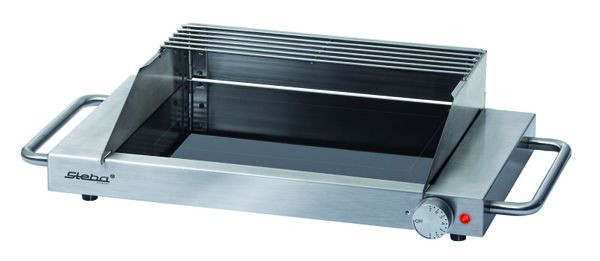 strapazierfähige Schott Ceran® Grillfläche, sehr gut geeignet zum japanischen Teppanyaki-Grillen, Spritzschutz, Ablagerost, minimale Aufheizzeit, Low-Fat-Funktion mit integrierter, herausnehmbarer Fettauffangschale, Cool-Touch-Griffe, auch als Warmhalteplatte oder Tassenwärmer nutzbar, Ceranfeld-Schaber