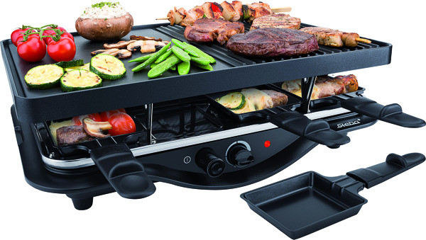 antihaftbeschichtete Alu-Druckgußplatte (ca. 45 x 30 cm), Grillfläche mit Grillmuster für Steaks oder Fisch und glattem Bereich, antihaftbeschichtete Pfännchen, stufenlose Temperaturregelung, Ein-/Ausschalter mit Kontrollleuchte