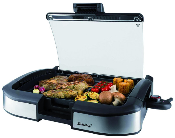 antihaftbeschichtete Alu-Druckguss-Grillplatte mit Grillmuster für Steaks oder Fisch und glattem Bereich und einer „Hot Zone“, integriertes Heizelement, Fettablauf mit integrierter Auffangschale, Glasdeckel mit Verschluss, stufenlose Temperaturregelung, Temperaturkontrollleuchte platzsparende senkrechte Aufbewahrung möglich