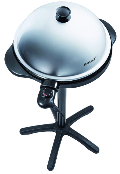 antihaftbeschichtete Grillplatte, schnelle Aufheizung und hohe Temperaturen durch integriertes Heizelement, Fettablauf in Auffangschale, abnehmbare Haube, thermoisolierte Handgriffe, stabiles Stativ mit großer Ablagefläche, leicht abnehmbar und als Tischgrill nutzbar, Temperaturkontrollleuchte