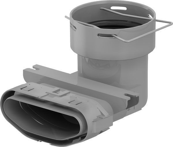 Beschreibung • Der Übergangsbogen von einem DN 75/90 LVS Rohr auf das flexible LVE - onfloor-Luftverteilsystem besteht aus Kunststoff. Zum Lieferumfang gehören Dichtung und Rastklammer. • Anschluss LVS bei Verlegung des LVE auf dem Estrich.
