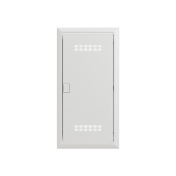Blendrahmen und Tür >media< mit Lüftungsöffnungen, passend zu Stromkreisverteiler UK64…, Stahlblech pulverbeschichtet, Farbe: alpinweiß, RAL 9016, der Tip-in-Türverschluss besticht durch sein modernes Design und die einfache Bedienbarkeit, für mehr Sicherheit ist ein Sicherheitsschloss als Zubehör erhältlich, leichtes Abnehmen von Blendrahmen und Tür mit Putzausgleichsmöglichkeit