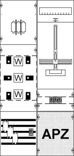 Mess- und Wandlerfeld, Komplettfeld, mit Zählerkreuz, für den Innenbereich, geltende Normen: DIN EN 61439-1, VDE 0660-600-1, DIN EN 61439-2, VDE 0660-600-2, Bemessungsstrom In 125 A, Abmessungen in mm (H x B x T): 1050 x 500 x 160, Zählerplatz verdrahtet, Netzsystem TN-S, 5-polig, Netzseitiger Anschlussraum Zählerplatz: mit Sammelschiene, Anzahl Zählerplätze Einzeltarif 1, Anzahl SG-Plätze 1, (300 mm), Anzahl Wandlerzählerplatz 1, Netzseitiger Anschlussraum Zählerplatz: mit Sammelschiene, verdrahtet nach den Vorgaben des NB, Spannungspfad Sicherungssockel D01/3-polig und D01/1-polig, Lastbereich: Sammelschienensystem Cu-Schienen 12 x 5 mm 5-polig, Trennstelle vor dem Wandler Sicherungsunterteile 1x3xNH00/125 A, Wandlerbereich Wandlerauflage aus Rollenstützern für Wandlerlasche mit 130 mm Lochabstand, Ritz: EKS 60-03, EKS 70-04, EKSO 63, EKSO 73, EKSO 74, MBS: EASK 31.3, EASK 31.4, EASK 31.5, EASK 41.4, EASK 41.5 (Beistellung NB), Trennstelle nach dem Wandler Unterteil 1 x 3 x NH00 mit Anschlussschrauben, Primärverdrahtung 70 qmm, Rasteinheit 7 RE, Bauhöhe 3, Feldbreite 2, Platzeinheiten 168, Abdeckungen aus Kunststoff, plombierbarer Schnellverschluss, RAL 7035