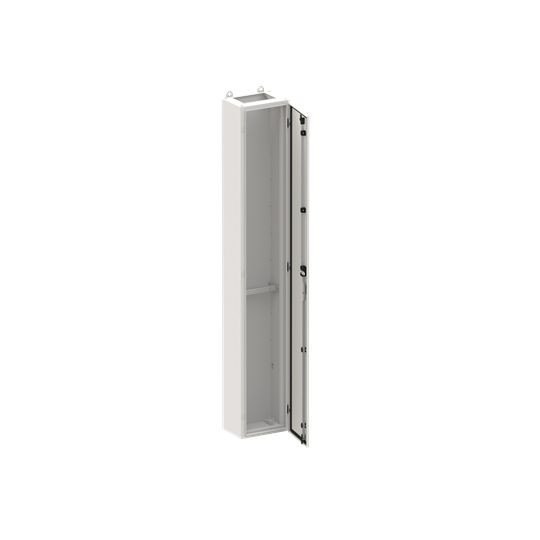 Standschrank, Baureihe TwinLine, Leerschrank, Montageart: Aufputz, teilversenkt, für den Innenbereich, mit Tür, Schutzklasse I (geerdet), Schutzart IP44, geltende Normen: DIN EN 61439-1, VDE 0660-600-1, IK-Code 08, pulverbeschichtet, in RAL 7035, Gehäuse aus Stahlblech, einflüglige Tür, Tür aus Stahlblech, mit Standardverschluss Doppelbart 3 mm, Türöffnungswinkel 180 Grad, Türanschlag rechts oder links, Rückwand aus Stahlblech, Leitungseinführung oben über Flanschöffnung ausgeschnitten, unten über Flanschöffnung vorgeprägt, Abmessungen in mm (H x B x T): 1850 x 300 x 225, Rasteinheit 12 RE, Bauhöhe 8, Feldbreite 1, Platzeinheiten 144, vorbereitet zum Einbau von Verteilerfeldern und CombiLine Modulsystemfeldern