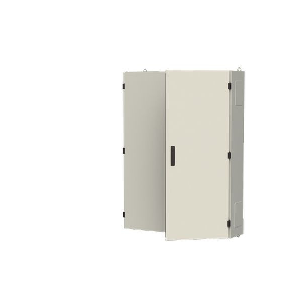Wandschrank, Baureihe TwinLine, Leerschrank, Montageart: Aufputz, teilversenkt, für den Innenbereich, mit Tür, Schutzklasse II (schutzisoliert), Schutzart IP55, geltende Normen: DIN EN 61439-1, VDE 0660-600-1, DIN EN 61439-2, VDE 0660-600-2, DIN EN 61439-3, VDE 0660-600-3, IK-Code 08, pulverbeschichtet, in RAL 7035, Gehäuse aus Stahlblech, Doppeltür, Tür aus Stahlblech, mit Standardverschluss Doppelbart 3 mm, Türöffnungswinkel 180 Grad, Türanschlag rechts und links, Rückwand aus Stahlblech, Leitungseinführung oben über Flanschöffnung ausgeschnitten, unten über Flanschöffnung vorgeprägt, seitlich über Flanschöffnung vorgeprägt, Abmessungen in mm (H x B x T): 1400 x 1050 x 275, Rasteinheit 9 RE, Bauhöhe 5, Feldbreite 4, Platzeinheiten 432, vorbereitet für den Ausbau mit Zähler-, Verteilerfelder, Kombi-Sets, CombiLine-Module auf EDF-/WR-Montagegerüst