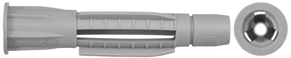 Hohlraumdübel mit Kragen, Polyethylen, als Universaldübel für nahezu alle Baustoffe geeignet (z. B. Beton, Vollstein, Lochstein, Porenbeton, Gipskarton und Gipsfaserplatten), verspreizt sich in Vollbaustoffen nach drei Seiten und verknotet sich bei Hohlräumen um die Schraube, für die Verarbeitung mit Holz- und Spanplattenschrauben, Vorsteckmontage, der Dübelkopf schließt bündig mit dem Untergrund ab