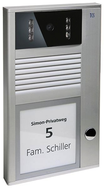 TCS-Video-Außenstation zur Aufputzmontage, AVC11010-0010 mit 1 Klingeltaste, Artikelnummer: AVC11010-0010, Bild / VIDEO EIGENSCHAFTEN, Color-Kamera mit CCD-Sensor , Tag/Nachtumschaltung: automatisch, Infrarotbeleuchtung für Nahfeldausleuchtung, diagonaler Erfassungswinkel: 90 Grad, Auflösung: 380 TVL, Brennweite: f = 3,6 mm , Lichtempfindlichkeit: 0,2 lux , Geräteeigenschaften, Video-Außenstation, Anzahl Klingeltasten: 1, Montageform: Aufputzmontage, Gehäuseform: Aufputzgehäuse, integrierter Lautsprecher, Material Gehäuse: Aluminium, Farbe Gehäuse: eloxiert natur, Material Klingeltasten: Metall mit wartungsfreien , Kontakten, bruchsicheres Namenschildglas, sensorgesteuerte Namensschildbeleuchtung, Öffnungsprinzip: win:clip, Lautstärke Sprachausgabe: einstellbar, Lautstärke Mikrofonempfindlichkeit: einstellbar, Erweiterte Eigenschaften, Lichtschaltfunktion: an unprogrammierter Klingeltaste, Namensfeld: weiß hinterleuchtet, Anzahl Drähte: 6-Draht notwendig, Installationsmix Audio, Video, Zutritt in einer Anlage: möglich, Inbetriebnahme und Konfiguration: manuell, mit Servicegerät, Speicher Anlagenkonfiguration: fest integriert, Technische Daten, Technologie: 2-Draht-TCS:BUS, Stromaufnahme, in Ruhe: im 6-Drahtbetrieb i(a) = 0,14 mA, I(P) = 50 mA, Stromaufnahme, maximal: i(Pmax) = 50 mA, Aufputzgehäuse HxBxT mm: 175x104x16, Kamerafeld HxB mm: 36x72, Info-/Namensschild HxB mm: 76x68, empfohlene Montagehöhe: 1,6 m, zulässige Umgebungstemperatur: -20 bis +50 Grad C, UV-Beständigkeit: uneingeschränkt, Lieferumfang, zum Wechseln der Namensschilder: win:clip-Schlüssel, zur Beschriftung: Namensschilder