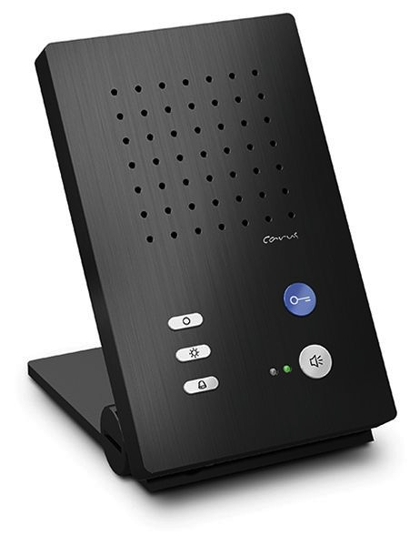 Carus Adapto Audio-Innenstation, Tischgerät, Gehäuse aus massivem Aluminium, handveredelte Strukturoberfläche, Tasten aus massivem Aluminium, laserbeschriftet, Farbe: schwarz, Tischfuß mit stufenlos einstellbarem Neigungswinkel schwarz eloxiert, incl. 2,5m Kabel (schwarz mit RJ45 Stecker), Freisprechen (hands-free) / manuell gesteuertes Wechselsprechen aktivierbar, automatisches Freisprechen nach Internruf aktivierbar, Türöffnertaste mit aktivierbarer Etagentüröffnerfunktion, Taste für Rufannahme bzw. Umschalttaste Sprechen / Hören, wenn Wechselsprechen aktiviert, Lichttaste, 1 Funktionstaste ab Werk: mit Steuerfunktion belegt / aktivierbare Alternativbelegung: Internruf, Türöffnerautomatik, Rufumleitung, Auswahl aus 13 Ruftönen, akustische und optische Rufunterscheidung zwischen Haus-, Wohnungstür und Internruf, akustische Türrufunterscheidung für 2 Türen, Ruftonlautstärke / manuell einstellbar, Ruftonabschaltung mit optischer Anzeige, 1 Parallelruf aktivierbar, optische Kurzzeitspeicherung von Türrufen, optische Besetztanzeige bei bestehender Sprechverbindung, Mithörsperre und automatische Gesprächsabschaltung, Audio- und Video-Innenstationen sind innerhalb einer Anlage kombinierbar, 3-Draht-Technik erforderlich, Eingangsstrom: I(a) = 0,4 mA, I(P) = 2 mA in Ruhe, maximaler Eingangsstrom: I(Pmax) = 100 mA, zulässige Umgebungstemperatur: -5 Grad C bis 40 Grad C, Gerätemaß: H 156 mm x B 101 mm x T 160 mm