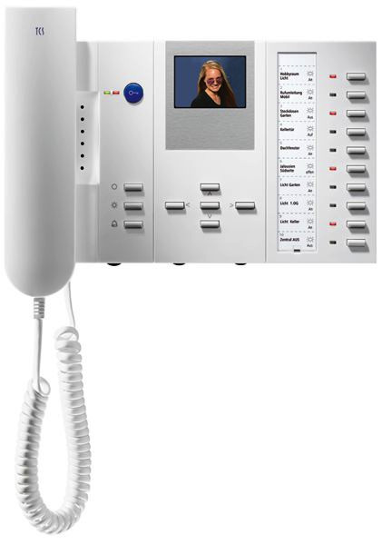 Aufputzmontage / aufstellbar (TischZubehör), Gehäuse aus antistatischem und recycelbarem Kunststoff, Audio- und Video-Innenstationen sind innerhalb einer Anlage kombinierbar, Farbe: weiß, basiert auf dem TCS-Videosystem in 6-Draht-Technik, zulässige Umgebungstemperatur: 0 Grad C bis 40 Grad C, Gehäusemaß: H 146 mm x B 246 mm x T 27 mm, Montagemaß: H 300 mm x B 246 mm x T 43 mm, Grundmodul: Gegensprechen, blaue Türöffnertaste mit aktivierbarer Etagentüröffnerfunktion, Lichttaste, 1 Funktionstaste ab Werk: mit Steuerfunktion belegt / aktivierbare Alternativbelegung: Internruf, Türöffnerautomatik, Rufumleitung, Auswahl aus 13 Ruftönen, akustische und optische Rufunterscheidung zwischen Haus-, Wohnungstür und Internruf, akustische Türrufunterscheidung für 2 Türen, Ruftonlautstärke / manuell einstellbar, Ruftonabschaltung mit optischer Anzeige, 1 Parallelruf aktivierbar, optische Kurzzeitspeicherung von Türrufen, optische Besetztanzeige bei bestehender Sprechverbindung, Mithörsperre und automatische Gesprächsabschaltung, Videomodul: Monitor in color mit TFT-Display, Bildschirmdiagonale in 6,0 cm (2,4 Zoll), Auflösung: 480 x 234 Pixel, Bildtaste zum Einschalten des Bildes bzw. zum Umschalten zwischen verschiedenen Kameras, 4 Steuertasten (rechts, links, auf, ab), Helligkeit, Farbsättigung / manuell einstellbar, Videosignaleingang symmetrisch 1 Vss FBAS, Komforttastatur, 10 Funktionstasten ab Werk: mit Steuerfunktion belegt / aktivierbare Alternativbelegung: gezielter Internruf, gezieltes Türsprechen, gezieltes Türöffnen, Rufumleitung, Zustandsanzeige Sensor mit Binäreingang, abwechselnde Steuerfunktion (Ein / Aus)