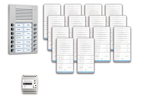 Vorkonfiguriertes Paket für 14 Wohneinheiten für den TCS:BUS bestehend aus: 1x Außenstation PES 14Tasten AP EN LED WS, Artikelnummer: PES14-EN/04, vorprogrammiert, 14x TASTA Freisprecher AUDIO PLUS WS, Artikelnummer: ISW6031-0145, 1x Vers. + Steuerg. BVS20 1Strang 4TE, Artikelnummer: BVS20-SG, Das Paket ist ab Werk vorkonfiguriert und bedingt erweiterbar, Die Funktionen der Innen- und Außenstationen können mit TCS-Serviceprodukten bedingt verändert werden, Die Komponenten unterstützen einen stand-alone-Betrieb