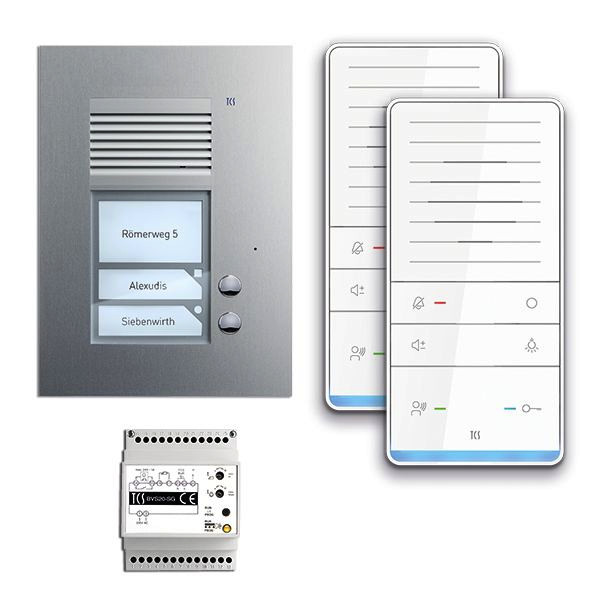 Vorkonfiguriertes Paket für 2 Wohneinheiten für den TCS:BUS bestehend aus: 1x Außenstation PUK 2Tasten 1 Spalte UP EN, Artikelnummer: PUK02/1-EN, vorprogrammiert, 2x TASTA Freisprecher AUDIO PLUS WS, Artikelnummer: ISW6031-0145, 1x Vers. + Steuerg. BVS20 1Strang 4TE, Artikelnummer: BVS20-SG, Das Paket ist ab Werk vorkonfiguriert und bedingt erweiterbar, Die Funktionen der Innen- und Außenstationen können mit TCS-Serviceprodukten bedingt verändert werden, Die Komponenten unterstützen einen stand-alone-Betrieb