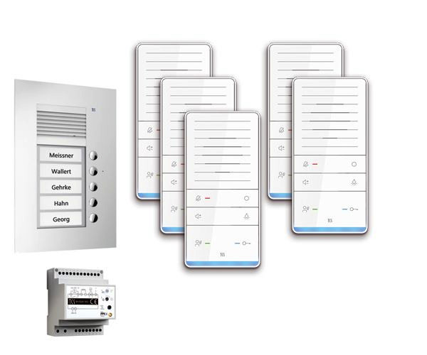 Vorkonfiguriertes Paket für 5 Wohneinheiten für den TCS:BUS bestehend aus: 1x Außenstation PUK 5Tasten 1Spalte UP EN, Artikelnummer: PUK05/1-EN, vorprogrammiert, 5x TASTA Freisprecher AUDIO PLUS WS, Artikelnummer: ISW6031-0145, 1x Vers. + Steuerg. BVS20 1Strang 4TE, Artikelnummer: BVS20-SG, Das Paket ist ab Werk vorkonfiguriert und bedingt erweiterbar, Die Funktionen der Innen- und Außenstationen können mit TCS-Serviceprodukten bedingt verändert werden, Die Komponenten unterstützen einen stand-alone-Betrieb