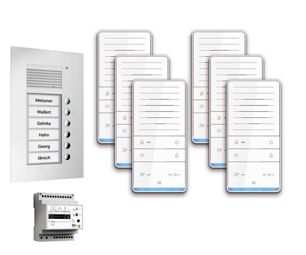 Vorkonfiguriertes Paket für 6 Wohneinheiten für den TCS:BUS bestehend aus: 1x Außenstation PUK 6Tasten 1Spalte UP EN, Artikelnummer: PUK06/1-EN, vorprogrammiert, 6x TASTA Freisprecher AUDIO PLUS WS, Artikelnummer: ISW6031-0145, 1x Vers. + Steuerg. BVS20 1Strang 4TE, Artikelnummer: BVS20-SG, Das Paket ist ab Werk vorkonfiguriert und bedingt erweiterbar, Die Funktionen der Innen- und Außenstationen können mit TCS-Serviceprodukten bedingt verändert werden, Die Komponenten unterstützen einen stand-alone-Betrieb