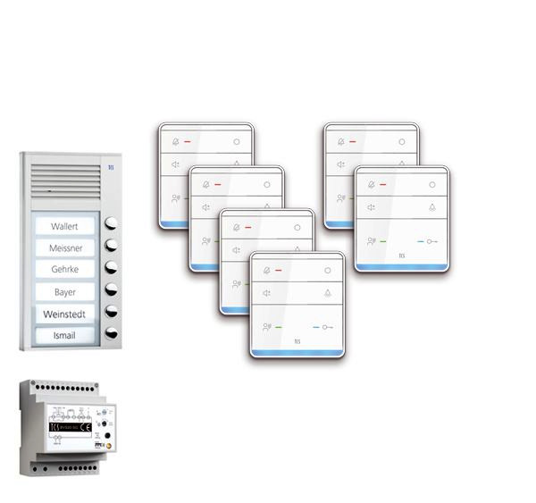 Vorkonfiguriertes Paket für 6 Wohneinheiten für den TCS:BUS bestehend aus: 1x Außenstation PAK 6Tasten AP EN, Artikelnummer: PAK06-EN, vorprogrammiert, 6x TASTA Freisprecher 6Tasten AP WS, Artikelnummer: ISW6010-0145, 1x Vers. + Steuerg. BVS20 1Strang 4TE, Artikelnummer: BVS20-SG, Das Paket ist ab Werk vorkonfiguriert und bedingt erweiterbar, Die Funktionen der Innen- und Außenstationen können mit TCS-Serviceprodukten bedingt verändert werden, Die Komponenten unterstützen einen stand-alone-Betrieb