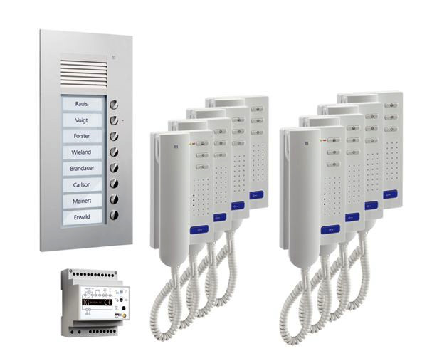 pre:pack8 Unterputz, bestehend aus bereits vorkonfigurierten TCS-Grundkomponenten: 1x Außenstation PUK08/1 EN/P, 8x Türtelefone ISH3030 (vorkonfiguriert), 1x Steuergerät BVS20-SG