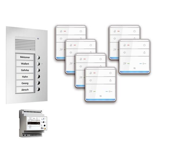 Vorkonfiguriertes Paket für 6 Wohneinheiten für den TCS:BUS bestehend aus: 1x Außenstation PUK 6Tasten 1Spalte UP EN, Artikelnummer: PUK06/1-EN, vorprogrammiert, 6x TASTA Freisprecher 6Tasten AP WS, Artikelnummer: ISW6010-0145, 1x Vers. + Steuerg. BVS20 1Strang 4TE, Artikelnummer: BVS20-SG, Das Paket ist ab Werk vorkonfiguriert und bedingt erweiterbar, Die Funktionen der Innen- und Außenstationen können mit TCS-Serviceprodukten bedingt verändert werden, Die Komponenten unterstützen einen stand-alone-Betrieb