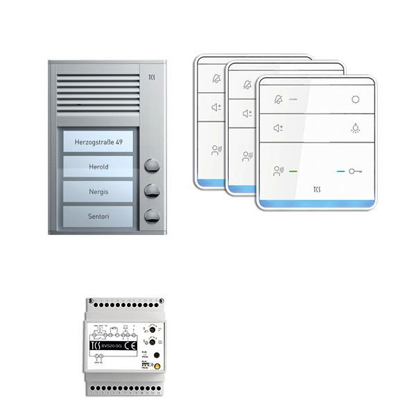Vorkonfiguriertes Paket für 3 Wohneinheiten für den TCS:BUS bestehend aus: 1x Außenstation PAK 3Tasten AP EN, Artikelnummer: PAK03-EN, vorprogrammiert, 3x TASTA Freisprecher 6Tasten AP WS, Artikelnummer: ISW6010-0145, 1x Vers. + Steuerg. BVS20 1Strang 4TE, Artikelnummer: BVS20-SG, Das Paket ist ab Werk vorkonfiguriert und bedingt erweiterbar, Die Funktionen der Innen- und Außenstationen können mit TCS-Serviceprodukten bedingt verändert werden, Die Komponenten unterstützen einen stand-alone-Betrieb