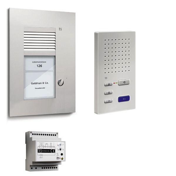 Alle 3 TCS-Grundkomponenten sind bereits fertig vorkonfiguriert, bestehend aus: 1x Außenstation PUK01/1-EN, 1x Innenstation Freispr Komfort 5 Tasten ISW3130-0140, 1x Steuergerät BVS20-SG, Funktionstaste am ISW3130-0140 mit Steuerfunktion 8 vorkonfiguriert