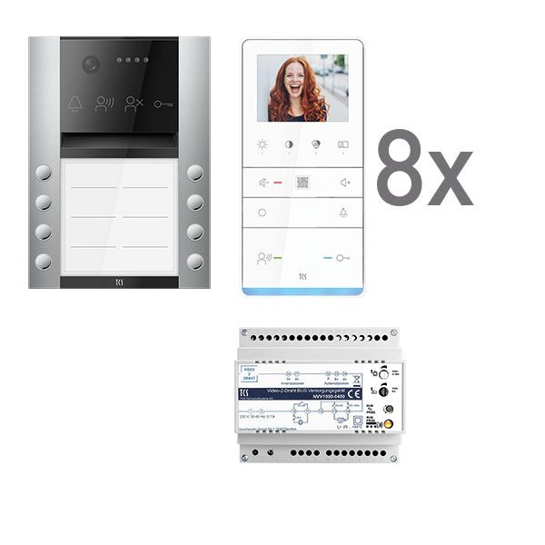 Vorkonfiguriertes Video Paket für 8 Wohneinheiten für den TCS:BUS bestehend aus: 1x PES PRO Video Außenstation 8T AP EN, Artikelnummer: AVA610208-0010, vorprogrammiert, 8x TASTA PRO Video Freisprecher 3,5" AP WS, Artikelnummer: IVW6511-0145, 1x Video-2-Draht:BUS Versorgungsgerät, Artikelnummer: NVV1000-0400. Das Paket ist ab Werk vorkonfiguriert und bedingt erweiterbar. Die Funktionen der Innen- und Außenstationen können mit TCS-Serviceprodukten bedingt verändert werden.