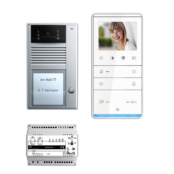 Vorkonfiguriertes Paket für 1 Wohneinheit für den TCS:BUS bestehend aus: 1x Außenstation VPAK Color V2D 1Taste AP EN, Artikelnummer: AVC12010-0010, vorprogrammiert, 1x TASTA PRO Video Freisprecher 3,5 AP WS, Artikelnummer: IVW6511-0145, 1x Video-2-Draht:BUS Versorgungsgerät, Artikelnummer: NVV1000-0400, Das Paket ist ab Werk vorkonfiguriert und bedingt erweiterbar, Die Funktionen der Innen- und Außenstationen können mit TCS-Serviceprodukten bedingt verändert werden, Die Komponenten unterstützen einen stand-alone-Betrieb