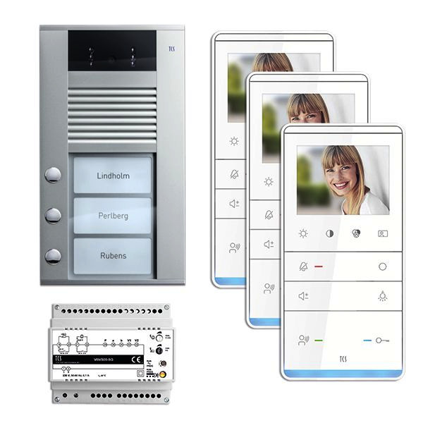 Vorkonfiguriertes Paket für 3 Wohneinheiten für den TCS:BUS bestehend aus: 1x Außenstation VPDS color 130 Grad 3Tasten AP EN, Artikelnummer: AVD14033-0010, vorprogrammiert, 3x TASTA PRO Video Freisprecher 3,5 AP WS, Artikelnummer: IVW6511-0145, 1x Vers. + Steuerg. VBVS05/02 1Strang 6TE, Artikelnummer: VBVS05-SG/02, Das Paket ist ab Werk vorkonfiguriert und bedingt erweiterbar, Die Funktionen der Innen- und Außenstationen können mit TCS-Serviceprodukten bedingt verändert werden, Die Komponenten unterstützen einen stand-alone-Betrieb