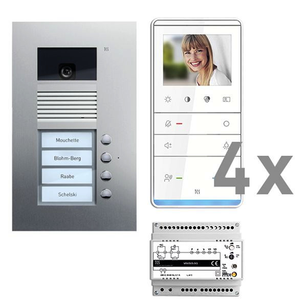 Vorkonfiguriertes Paket für 4 Wohneinheiten für den TCS:BUS bestehend aus: 1x Außenstation VPUK color 4Tasten 1Spalte UP EN, Artikelnummer: AVU14040-0010, vorprogrammiert, 4x TASTA 3,5 Zoll Freispr. AP WS/WS, Artikelnummer: IVW6511-0145, 1x Vers. + Steuerg. VBVS05/02 1Strang 6TE, Artikelnummer: VBVS05-SG/02, Das Paket ist ab Werk vorkonfiguriert und bedingt erweiterbar, Die Funktionen der Innen- und Außenstationen können mit TCS-Serviceprodukten bedingt verändert werden, Die Komponenten unterstützen einen stand-alone-Betrieb