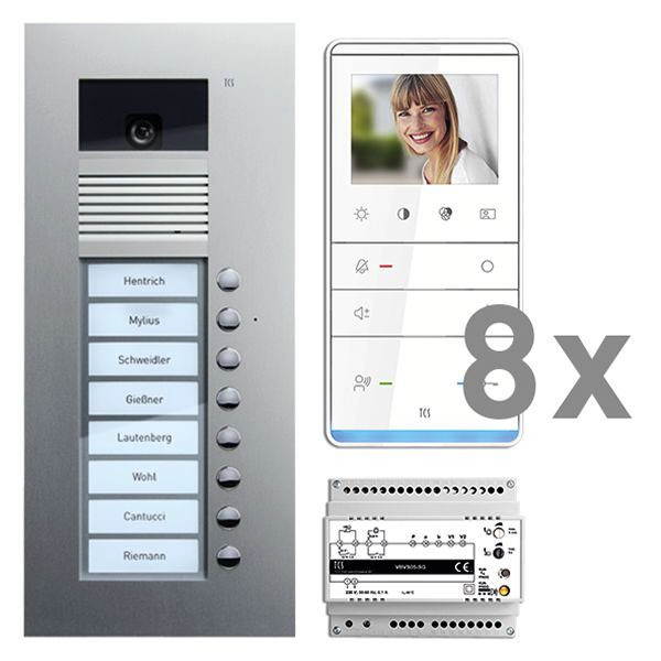 Vorkonfiguriertes Paket für 8 Wohneinheiten für den TCS:BUS bestehend aus: 1x Außenstation VPUK color 8Tasten 1Spalte UP EN, Artikelnummer: AVU14080-0010, vorprogrammiert, 8x TASTA 3,5 Zoll Freispr. AP WS/WS, Artikelnummer: IVW6511-0145, 1x Versorgungs- und Steuergerät Video 8 T, Artikelnummer: NBV2600-0400, Das Paket ist ab Werk vorkonfiguriert und bedingt erweiterbar, Die Funktionen der Innen- und Außenstationen können mit TCS-Serviceprodukten bedingt verändert werden, Die Komponenten unterstützen einen stand-alone-Betrieb