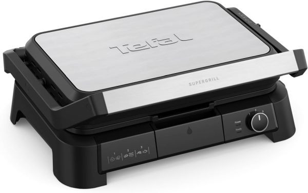 800 cm² antihaftbeschichtete Grillfläche, spülmaschinenfeste Wechselplatten, Saftschale, Ein/Aus-Schalter, einstellbares Thermostat mit 3 Temperatureinstellungen, Temperaturkontrollleuchte, vertikale Lagerung möglich