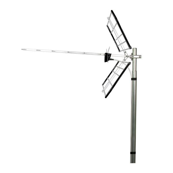 Yagi-Antenne für UHF-Empfang, mit Reflektor und Doppel-V-Dipolen. Kanal 21 bis 48. Verstärkung: 12dB.