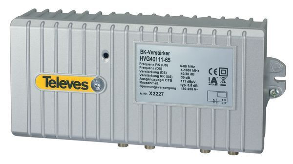 | Kurzbeschreibung | BK-Guss-Verstärker 40 dB, CTB 111 dB, 5-1006 MHz, RK 30 dB, IP65 |