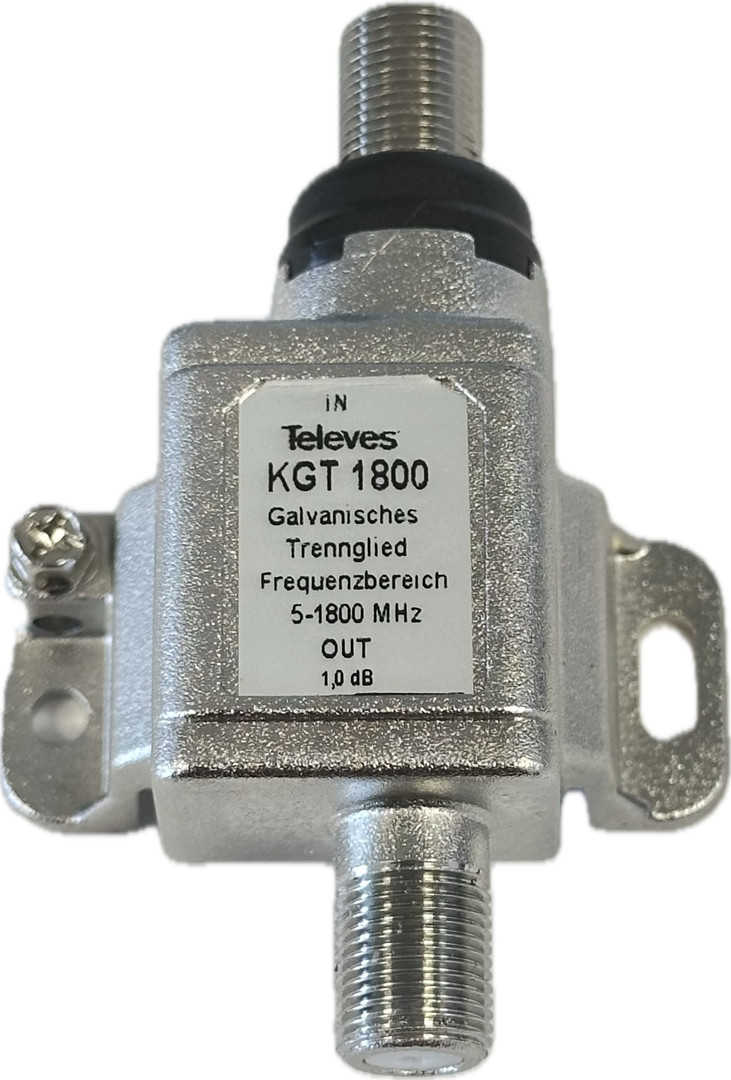 Das galvansche Trennglied KGT1800, Frequenz 5 - 1800 MHz, dient zur kapazitiven Trennung des Innenleiters und der Schirmung zur Vermeidung von Ausgleichströmungen zwischen unterschiedlichen Potentialen. Das Trennglied wird am Übergabepunkt eingesetzt und mit dem Potentialausgleich des Gebäudes verbunden. Das Trennglied wird incl. AP-Gehäuse geliefert. Abmessungen mit Gehäuse BxHxT: 150x60x40 mm