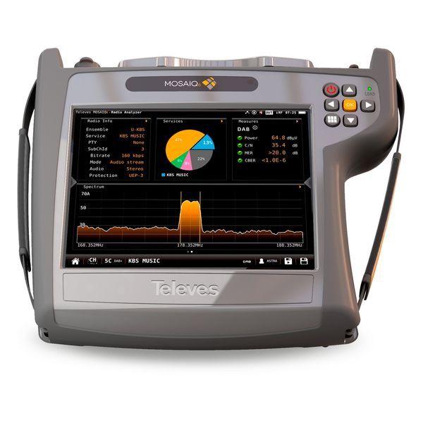 Die DAB/DAB+ Option ermöglicht die Demodulation eines DAB-Kanals mit Messungen der Signalqualität wie MER und CBER und umfassenden Informationen über die angebotenen Dienste: Radio Info: ( PTY, Service, Modus, Audio, Audio-Bitrate). Zur Leistungsmessungen mit Eingangspegeln zwischen 20 dBµV und 128 dBµV, C/N und MER.