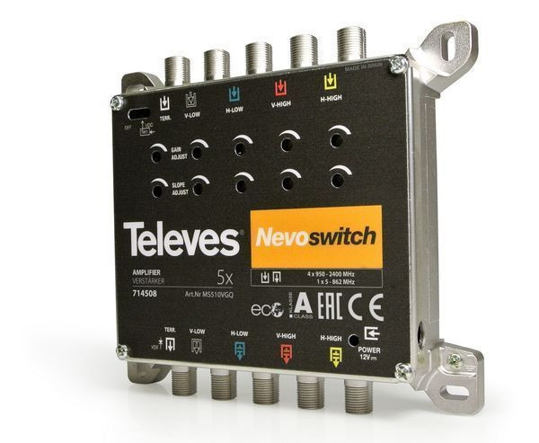 NevoSwitch Verstärker mit 5 Eingängen (1 x Terrestrik und 4 x SAT) zur Verstärkung der Signale, so dass die Teilnehmerzahl erhöht werden kann, bei gleichbleibend gutem Signal. Verstärkung im terr. Bereich 10 dB und im SAT-Bereich 11 dB.