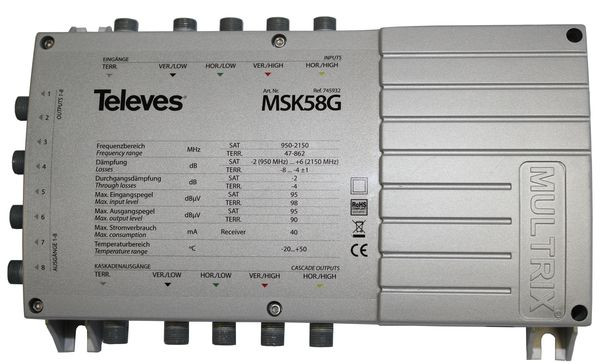 MULTRIX - Kaskadierbares Multischaltersystem und dazugehörige Systemverstärker Kaskadenmultischalter MSK 54 G und MSK 58 G können auch zur Erweiterung der Multischalter MS 54 NG - MS 516 NG verwendet werden Die Bauteile MSB 54 NG, MSB 58 NG, MSV 411 G und MSV 511 G können an beliebiger Stelle im Kaskadensystem eingesetzt werden Die Bauteile können mit den Quickverbinder FSQ 2 direkt zusammengesteckt werden.