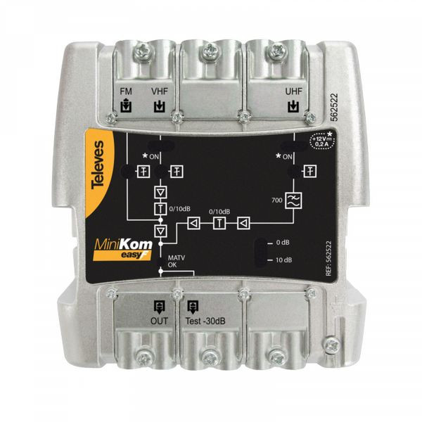 MiniKom EasyF Mehrbereichsverstärker 3 Eingänge: UKW-VHF-UHF Konfigurierbarer Mehrbereichsverstärker für MATV-Systeme mit separater Verstärkung ohne Intermodulation zwischen Eingängen. Ausgestattet mit 3 Eingängen: UKW-VHF-UHV. Ausgestattet mit einem LTE700-Filter und einer LED-Signalanzeige für sofortige Erkennung von Netzstörungen.