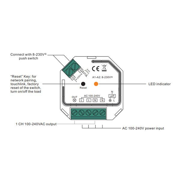 Netzschalter basierend auf den neuesten Zigbee 3.0-Protokollen. 100-240V AC Eingangs- und Ausgangsspannung. AC-Push Switch Eingang. Kompatibel mit den meisten Smart-Home-Systemen. Unterstützt TouchLink-Kommunikation mit Zigbee-Fernbedienungen und Schaltern. Kleine Größe, passt in eine Standard-Wanddose. HINWEIS: Nicht potentialfreier Ausgang.